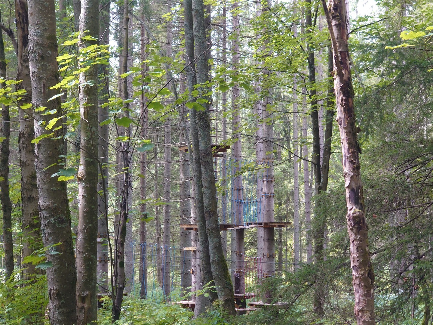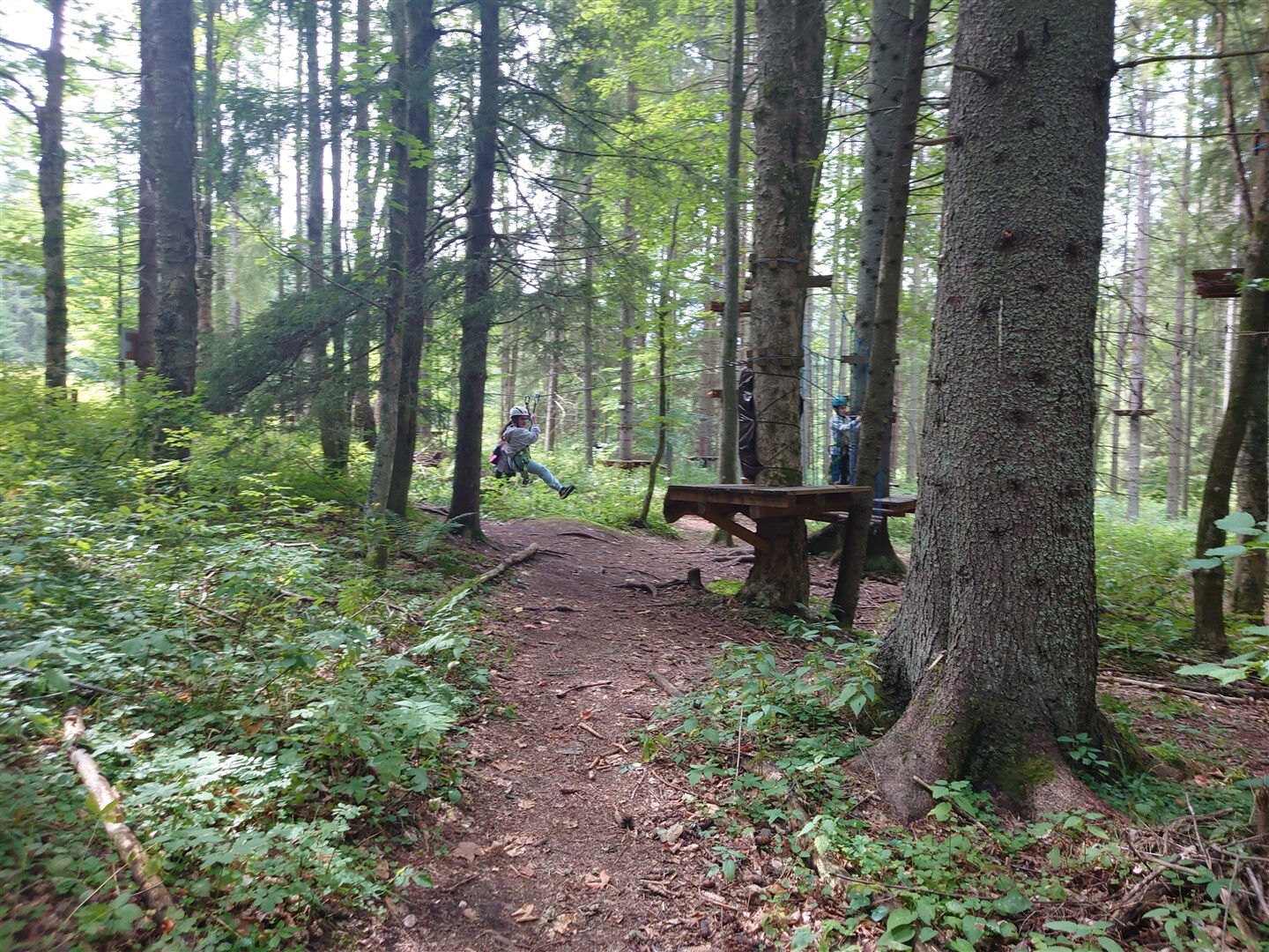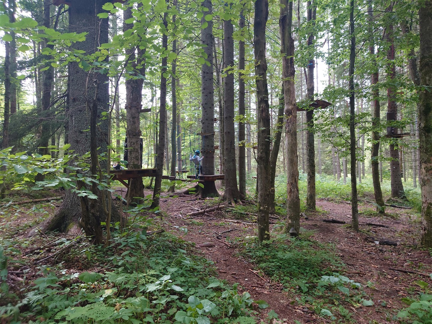 Dla młodszych dzieci przygotowano osobną trasę o długości około 108 metrów, przeznaczoną dla osób poniżej 150 cm wzrostu. Układ przeszkód jest podobny do tego na trasie dla dorosłych, ale wszystkie elementy znajdują się znacznie niżej nad ziemią. Dzięki temu opiekunowie mogą iść obok i w razie potrzeby pomagać dzieciom na każdym etapie przejścia. Dzieci przez cały czas są przypięte do linii asekuracyjnej, co zapewnia im bezpieczeństwo i pozwala skupić się na samej zabawie, bez stresu i pośpiechu. To bardzo dobry pomysł na aktywne spędzenie czasu całą rodziną - trochę ruchu, dużo radości i leśne otoczenie, które tylko dodaje temu miejscu uroku.